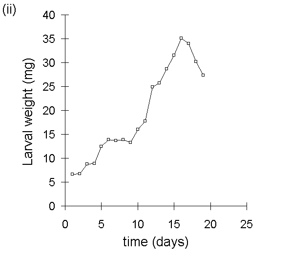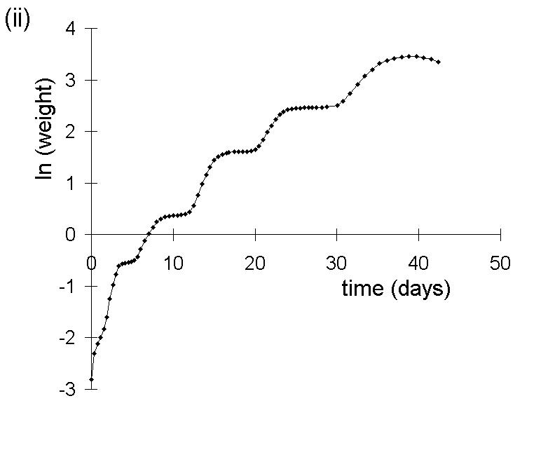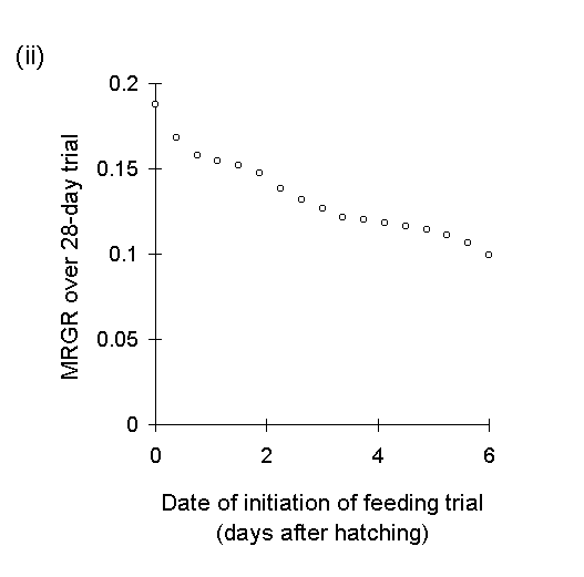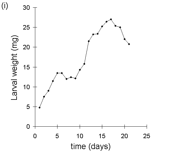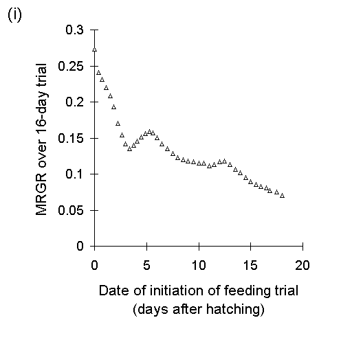 The logarithmic MRGR values shown in Fig. I-2 vary by a factor of three, depending on the precise stage of larval development measured. As expected, logarithmic MRGR values are displaced upwards for feeding trials commencing with early-instar larvae (Fig. I-2i , days 1-5).
