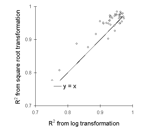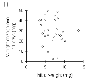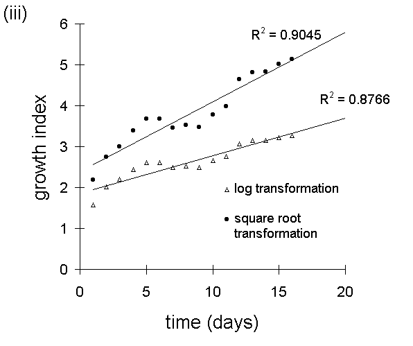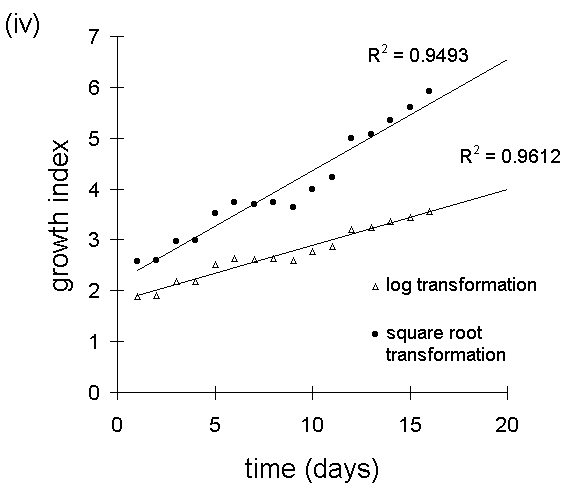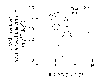 The approach taken in this thesis has been to abandon the use of MRGR altogether, for the reasons above, and whenever possible to perform statistical analyses on simple untransformed larval growth rates (mg day-1) (Chapters 3 & 5). On two occasions, however, a square root transformation was applied to larval weight data prior to the calculation of growth rates (Chapters 6 & 7), in order to fulfil the assumptions for analysis of variance (Mead et al., 1993). The use of a square root transformation does not incur the same problems as discussed above for the MRGR: there is less distortion at low weights (Fig. I-4), and lower probability of an artefactual relationship between growth rate and initial larval weight (Fig. I-5).
