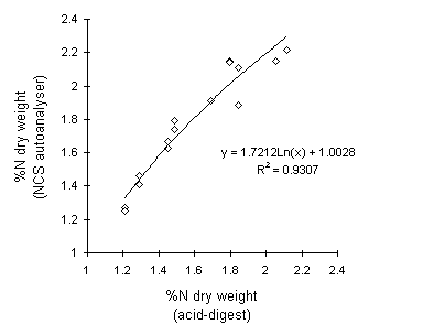 The NCS analyser gave consistently higher results than the acid digest technique (Fig. II-1). NCS values were greater than acid digest values by a mean factor of 11.6% (s.e. = 1.62%). The mean difference in total nitrogen concentrations between assay methods was 0.184% N (s.e. = 0.027% N). Despite these differences, there was a strong curvilinear relationship between the two sets of values (Fig. II-1).