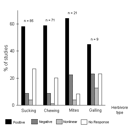 Figure 1-1. Responses of four types of insect herbivore to nitrogen fertilisation of their host-plants, expressed as percentage of studies reviewed. Data and figure redrawn from Waring & Cobb (1992).
