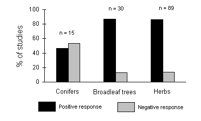 Figure 1-2. Percentage of studies in which insect herbivores responded positively or negatively to nitrogen fertilisation in conifers, broadleaf trees and herbaceous plants. Data and figure redrawn from Waring & Cobb (1992).