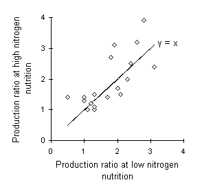 Figure 1-3. The effects of CO2 enrichment on 16 different plant species under both low and high nitrogen availability in 12 different studies. Production ratio is calculated as (rate of biomass accumulation at twice-ambient [CO2]) / (rate of biomass accumulation at ambient [CO2]). Solid line shows equality between low-nitrogen and high-nitrogen responses. There is no evidence that the production ratios differ significantly between nitrogen treatments (t17 = 1.18, n.s.). Data obtained from Table 1 in Lloyd & Farquhar (1996).