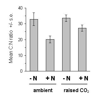 There was no significant effect of the raised CO2 treatment on Calluna C:N ratio (Fig. 7-9). However, nitrogen fertilisation caused a highly significant reduction in the C:N ratio of Calluna current year's growth (Fig. 7-9). Mean absolute total nitrogen concentrations were 2.81% (s.e. 0.168 %) in nitrogen-treated plants and 1.77 % (s.e. 0.096 %) in untreated plants.