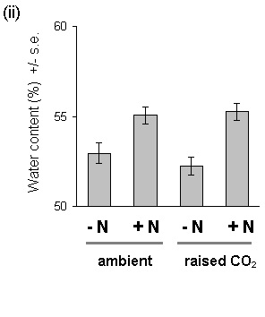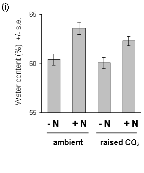 Nitrogen treatment also resulted in significantly increased water content of both current year's shoots and previous years' foliage (Fig. 7-10). The physiological cause of this effect is unclear, although it has been observed in previous studies of Calluna nitrogen fertilisation (V.K. Brown. pers. comm.). There was no effect of CO2 on foliar water content.