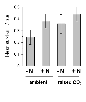 The raised CO2 treatment had no significant effect on O. brumata survival to harvest in 1994 (Fig. 7-11). There was no significant effect of the nitrogen treatment on survival (Fig. 7-11), and no direct relationship between survival and the measured C:N ratio in the harvested foliage (F(1,63) = 1.44, n.s.). There was a significant brood effect on survival in 1994 (F(9,67) = 2.28, p < 0.05), but because "survival" in this case was uncorrected for initial hatching numbers, this effect could have been due to inter-brood variation in egg viability.