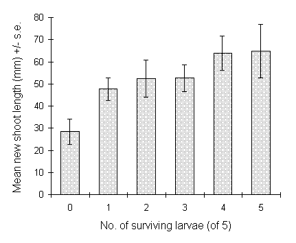 Larval emergence occurred from 22 May 1994 onwards, and larvae were seen to be adequately constrained by the feeding bags on this date. Twenty-eight days after this date, on 19 June 1994, feeding bags were removed and the enclosed foliage was searched for O. brumata larvae. Numbers of surviving larvae, their instar stage (Cuming, 1961) and fresh weight were recorded. Larvae were then put back into the feeding bags and replaced on the original plant, in order to permit further development to the pre-pupal stage. However, mortality in the feeding bags at the pre-pupal stage was too high to permit the recovery of pupal weight data in this year of the experiment.
