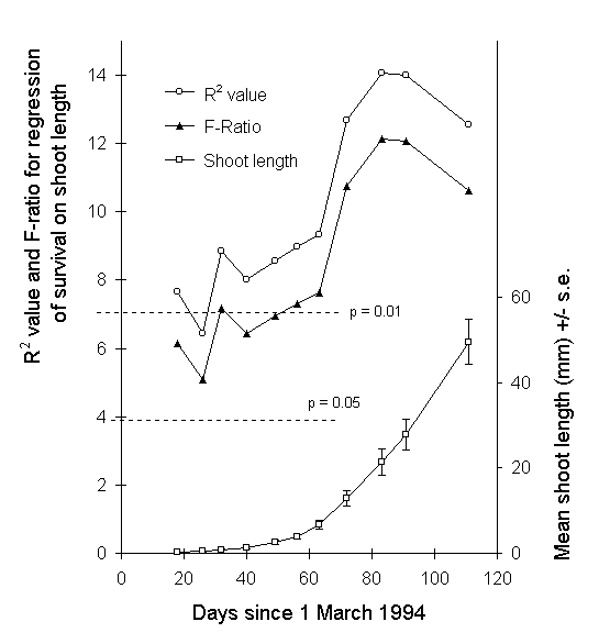 To determine the developmental stage at which the above effect was most likely to have operated, the predictive power of shoot length on ultimate larval survival was determined by logistic regression, using data sets from each of the eleven shoot length measurements taken during the 1994 growth season, the last three of which spanned the duration of the feeding experiment. Shoot length at each date was a significant predictor of ultimate larval survival (Fig. 7-13).