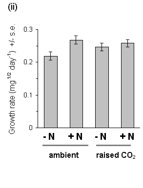 Covariance analysis of current year's shoot extension rate between O. brumata hatch and harvest dates, with shoot length at the former date as the linear covariate, showed a highly significant main effect of nitrogen treatment (F(1,69) = 12.74, p < 0.001). Nitrogen fertilisation, therefore, produced an increase in shoot extension rate once new shoots had begun to grow, but did not affect the date of inception of new growth (Fig. 7-6ii). There was no significant CO2 -nitrogen interaction on Calluna shoot length at harvest date (F(1,70) = 0.56, n.s.), and hence no evidence for nutrient-limitation of Calluna growth response to CO2 (see Section 1.6).
