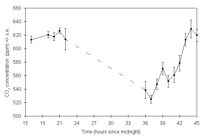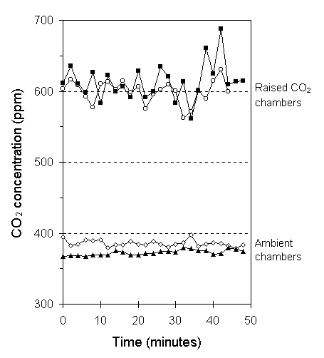 Longer-term fluctuations in the mean chamber CO2 concentration were observed (Fig. 7-2), with the highest mean concentrations of approximately 630 ppm occurring around midnight, and the lowest of 530 ppm shortly after midday. This pattern of variability is consistent with the expected diurnal variation due to changes in photosynthesis rates (Leadley & Drake, 1993), although the magnitude of the variation was larger than that found in a similar study by Ashenden et al. (1992).