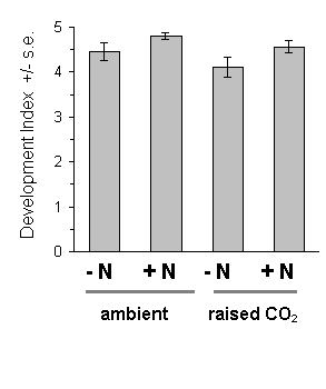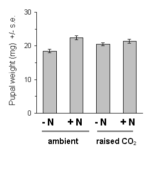 Growth of Calluna under raised CO2 conditions produced no significant main effect on any aspect of O. brumata development, either in 1994 or in 1995. There was a significant CO2 -nitrogen interaction effect on pupal weight in 1995 (Fig. 7-16), but the size and significance of this effect were marginal. Since no other significant CO2 -nitrogen interaction was found in this study, it is unlikely that the above effect on pupal weight is of physiological importance.