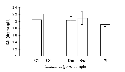 The measurements of Calluna nitrogen concentration in the field reinforce the point made in Section 7.4.3, that the nitrogen fertiliser treatment in the feeding trial was a severe manipulation; fertilised Calluna plants in the feeding trial showed a mean nitrogen concentration of 2.81% , which was considerably greater than the highest value obtained in field-sampled vegetation of 2.21% (Orkney C2).