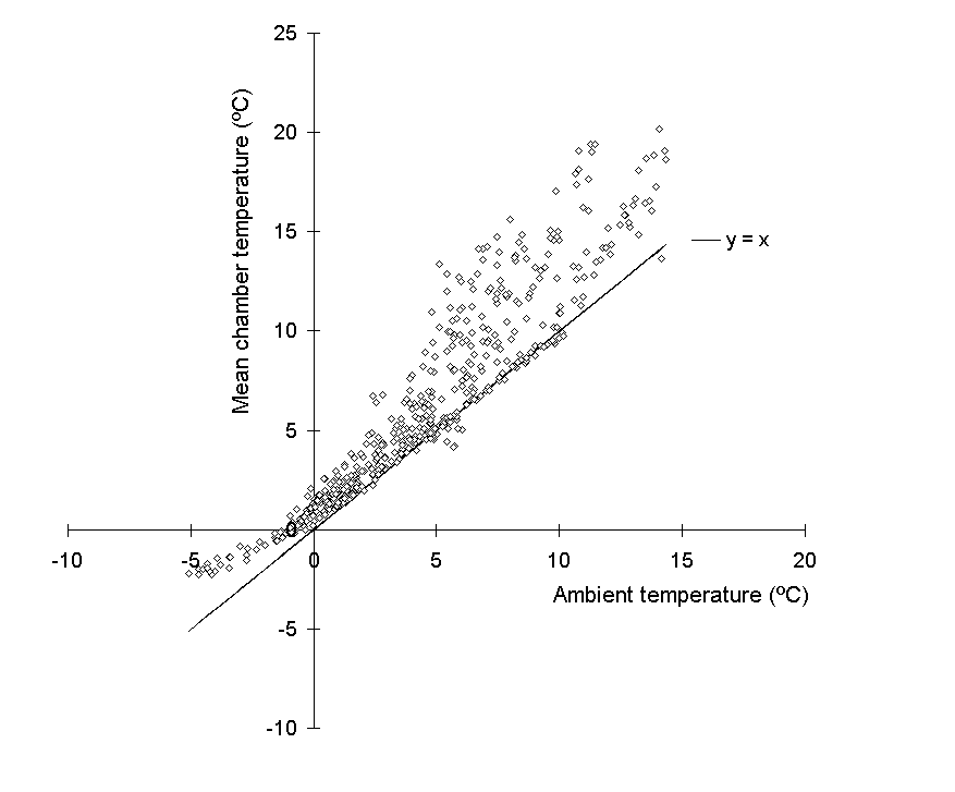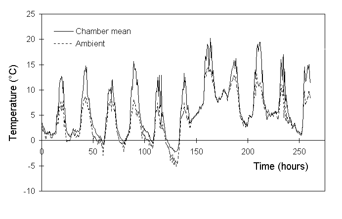 Temperatures inside the chambers were frequently higher than those outside (Fig. 7-3), and Figure 7-4 suggests that two separate warming mechanisms operated at either extreme of the ambient temperature range. High ambient temperatures around midday were associated with a strong chamber warming of up to 8ºC (Fig 7-4). Greenhouse warming as a result of direct solar radiation was the most probable cause of this effect, which was larger than the 2 to 4ºC warming reported by Ashenden et al. (1992). A warming effect of up to 3ºC was also observed at low night-time temperatures (Fig. 7-4), although its cause was unclear.