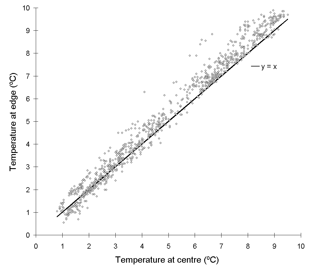 There was also a small but consistent "edge effect" inside the chambers, with air temperatures at foliage level approximately 0.5ºC warmer for plants nearest to the chamber walls than for those at the centre (Fig. 7-5) over the 5ºC to 10ºC range.