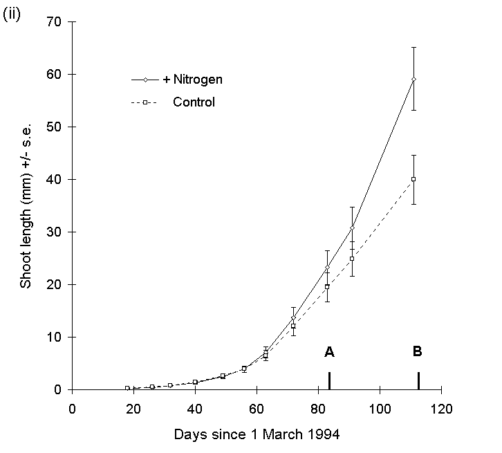Figure 7-6. Mean shoot extension (+/- s.e.) of Calluna plants with time, 1994. (i): current year's shoot lengths for all raised-CO2 plants and all ambient CO2 plants. (ii): current year's shoot lengths for all nitrogen-enriched plants and all unfertilised control plants. Points A and B represent dates of emergence (22 May) and harvest (19 June) of O. brumata larvae respectively. Effect of nitrogen is significant at O. brumata harvest date: F(1,70) = 12.28, p < 0.001.