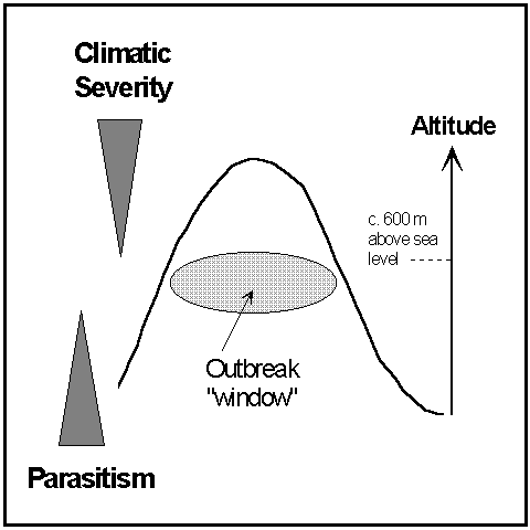 The above model does not include effects of predation, disease and host-plant chemical defences. Although studies of other insect-plant systems have highlighted the importance of these effects (Haukioja, 1980; Roland, 1990; Myers & Kuken, 1995), too little is currently known about their spatial and temporal patterns of operation in moorland O. brumata populations. Furthermore, the above model may not apply to outbreaks on low-altitude Orkney moorlands, where the rôles of climatic severity and escape from parasitism are less clear (see Sections 8.1.3 & 8.1.4). Nevertheless, the model may serve to stimulate further investigation of the relationships between climatic variability, natural enemy pressure and O. brumata abundance as a function of altitude (see Preszler & Boecklen, 1996).